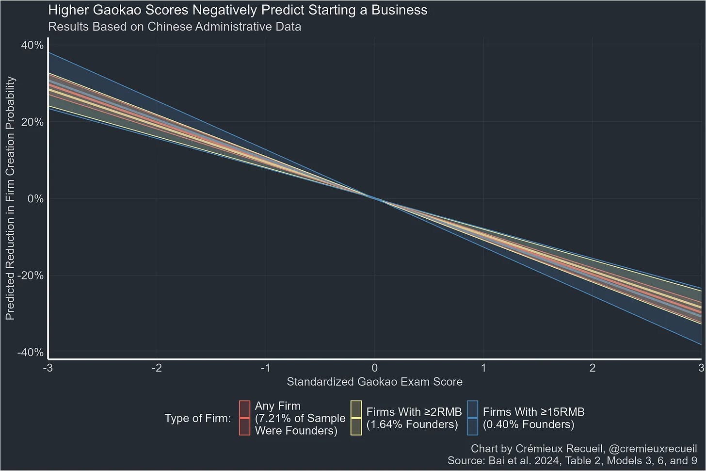 Almost tragically, however, higher Gaokao scores correlate negatively with starting a company (please see this wonderful chart made by Cremieux).
